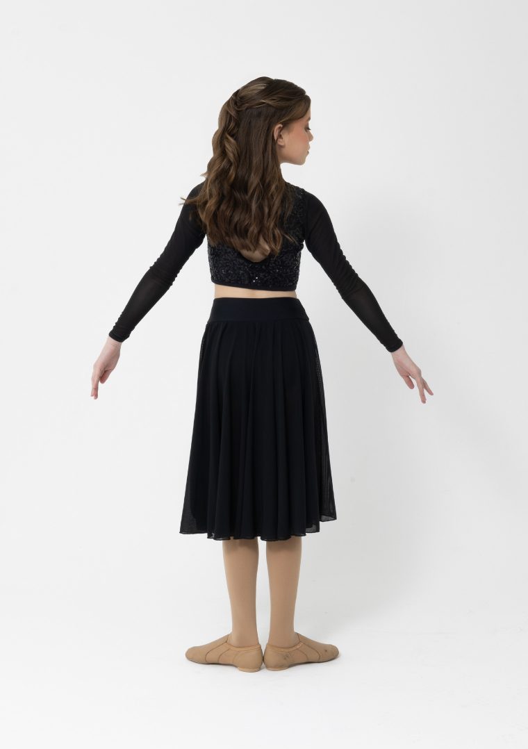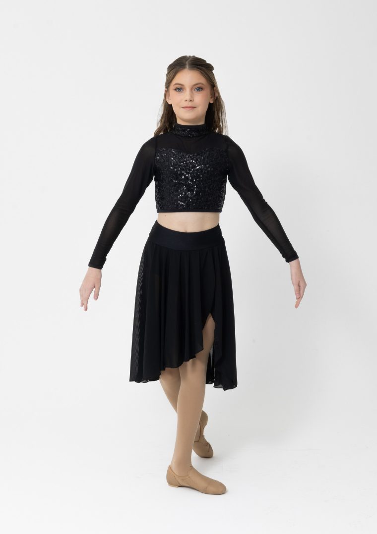 A beautiful flowing diagonal front mesh skirt with high waisted dance brief, in a range of colours for your contemporary or lyrical performance.