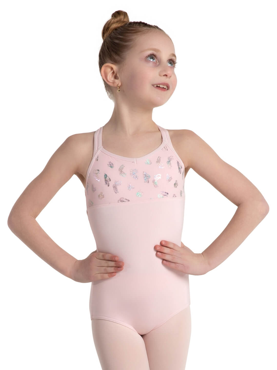 Float across the floor in the Yara Leotard. This cami-style leotard with crossing back straps will have your little dancer feeling confident and secure. Butterfly-print mesh overlay for a colorful added detail.